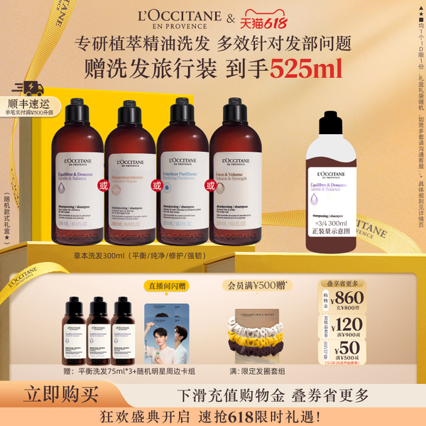 店铺满300立减30,到手270元;凑单900-120美妆惊喜券,到手230元;88vip叠加9折无门槛消费券(立减23),到手207元;赠护发75ml*2+洗发75ml*2,直播间闪赠明星小卡;单笔实付满500加赠限定发圈套组 欧舒丹洗发水合集草本平衡强韧洗发露清洁,针对解决多种秀发问题,强韧、去屑、修护等;自用送礼不出错