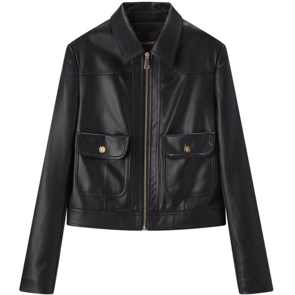太平鸟黑色正肩仿蛋白PU皮衣外套女2025款高级感翻领夹克女#