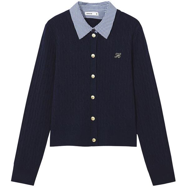 热风针织开衫2025年秋季新款女士修身假两件POLO领细密绞花针织衫