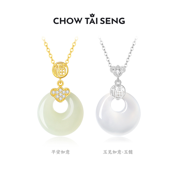 周大生福气平安扣纯银项链女款和田玉吊坠玉髓配饰送妈妈新年礼物