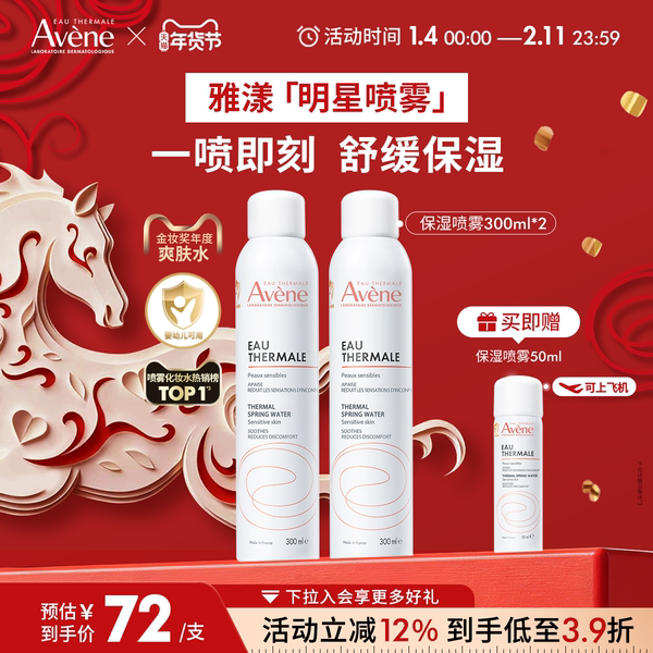 【官方立减13.2元,超级淘客限时补贴4.3元,消费券抵扣8.8元,到手61.7元,】雅漾舒泉保湿喷雾300ml*2瓶,品质优选~