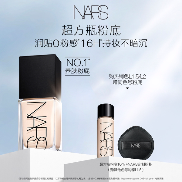 【赠大白饼3g+腮红2.5g(愉悦红粉)+定制粉扑【到手290左右】NARS超方瓶粉底,轻薄润贴,持妆不卡粉,润贴O粉感,16H持妆不暗沉~